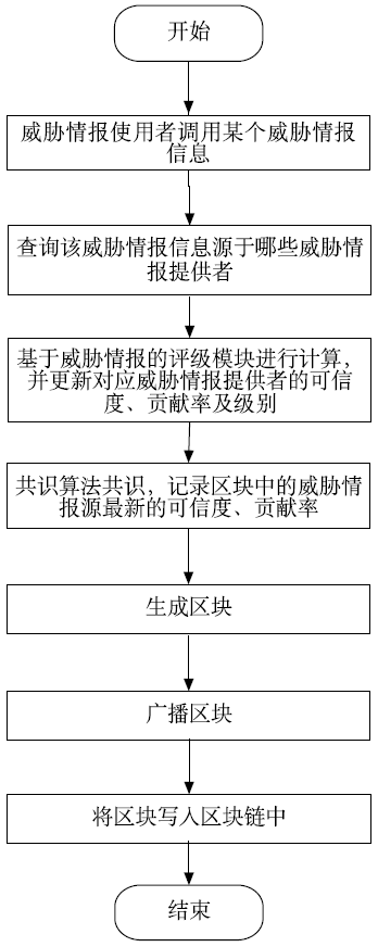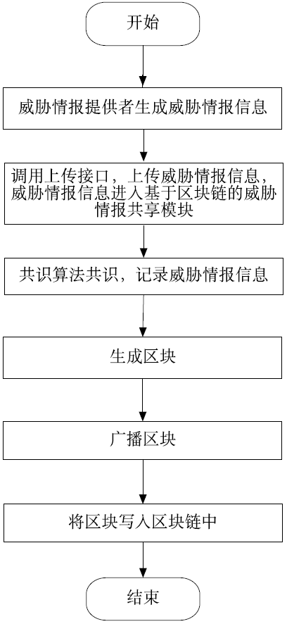 图4 基于区块链的威胁情报共享及评级系统结构基于区块链的威胁情报共享及评级系统包括底层区块链模块、基于区块链的威胁情报共享模块、基于区块链的威胁情报评级模块三大部分。(1)底层区块链模块,用于对威胁情报共享的所有节点进行区块链技术的支撑与实现,如共识算法等。(2)基于区块链的威胁情报共享模块,用于对区块链中的IP地址信息、域名信息、URL信息、安全事件信息、漏洞信息等威胁情报信息进行共享。(3)基于区块链的威胁情报评级模块,用于对区块链中的威胁情报源可信度、威胁情报源贡献率进行计算,并评级。4.4 基于区块链的威胁情报共享方法基于区块链的威胁情报共享方法流程如图5所示。基于区块链的威胁情报共享方法包括以下步骤。