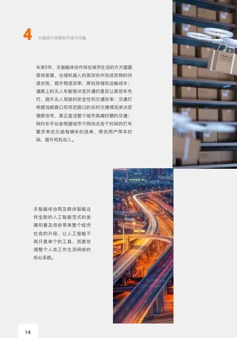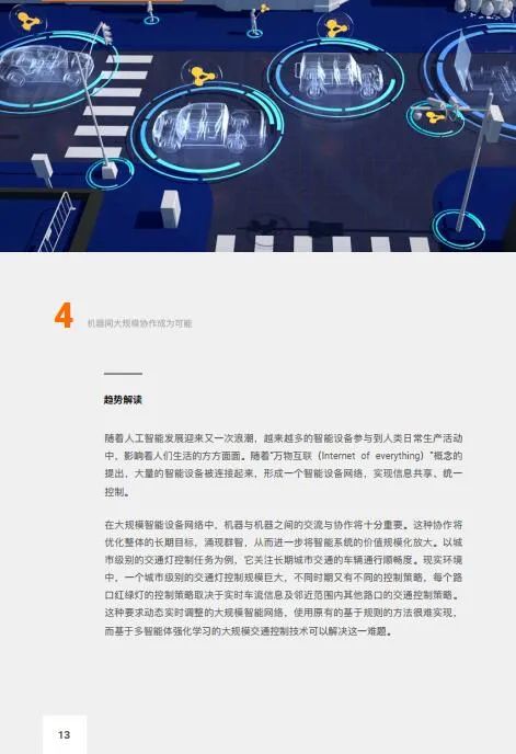 【趋势概要】传统单体智能无法满足大规模智能设备的实时感知、决策。物联网协同感知技术、5G通信技术的发展将实现多个智能体之间的协同——机器彼此合作、相互竞争共同完成目标任务。多智能体协同带来的群体智能将进一步放大智能系统的价值:大规模智能交通灯调度将实现动态实时调整,仓储机器人协作完成货物分拣的高效协作,无人驾驶车可以感知全局路况,群体无人机协同将高效打通最后一公里配送。