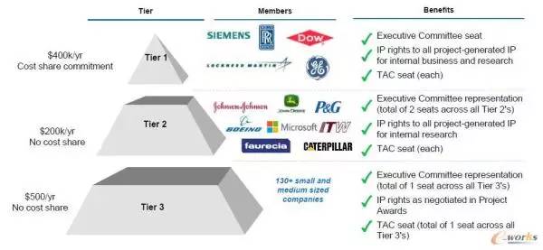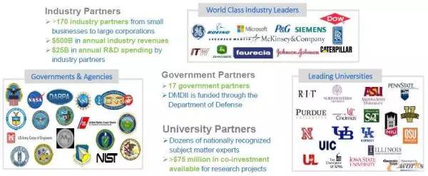 此次考察,我们参观了美国国家制造业创新网络已建成的九个研究之一的数字制造与设计创新研究所(DMDII)。DMDII成立于2014年2月,目前已获得美国国防部8500万美元的经费,以及来自工业界的会员费和承诺投资2.7亿美元,已完成35个研究项目,政府、企业和高校协同推进数字制造。企业会员分为三个级别,需要支付不同级别的会员费,也获得不同等级的权益;高校则通过投入人力资源的方式,来分摊研究费用。这种方式责权利很清晰。