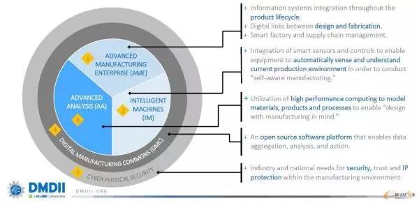 DMDII利用这些经费发布研究项目,由会员来申报和具体承担项目。目前,DMDII的研究领域包括先进制造企业(AME)、智能机器、高级分析、数字制造公共服务平台和工业安全等。DMDII位于芝加哥市中心,由一座废弃的工厂厂房改建而成,提供了近万平米的车间和各类加工设备、增材制造设备和测试设备,也提供了很大的展示和研发场地,提供给会员使用。