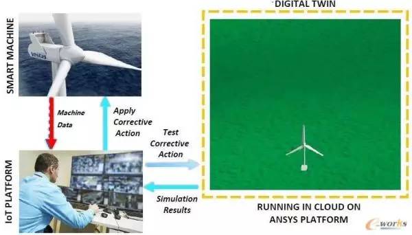 ANSYS展示了一个风电应用的典型案例。通过ThingWorx物联网平台,将采集的机器运营数据进行处理,并通过仿真云平台对采集的数据进行仿真分析;再根据分析结果,通过物联网平台计算出需要采取的优化方案,传递给风机,从而提升风机的运营效果。