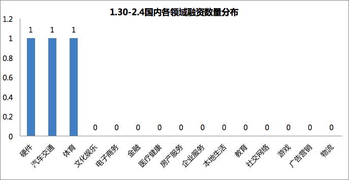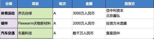 关于国内,本周3起融资分布于体育运动(乔氏台球)、硬件(Flexwarm天物新材料)、汽车交通(车赢科技)领域,且3起融资都为A轮项目。详细融资事件如下: