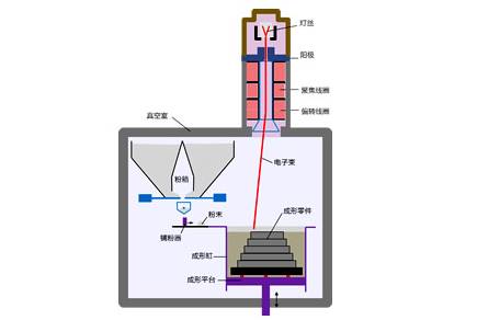 电子束选区熔化技术(Electron Beam Selective Melting,EBSM)的原理与SLM类似,只不过EBSM是在真空环境中,以电子束作为输出热源。相比激光,电子束更容易获得,可以相应的降低部分加工成本,同时真空的工作环境也可以有效保证钛合金和铝合金在内的很多活泼金属在加热过程中不易被氧化。