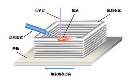 电子束熔丝沉积技术(ElectronBeamFreeformFabrication,EBFF),是电子束焊接技术(EBM)和快速成形思想结合的产物。在真空环境中,高能量密度的电子束轰击金属表面,在前一沉积层或基材上形成熔池,金属丝材受电子束加热融化形成熔滴。随着工作台的移动,使熔滴沿着一定的路径逐滴沉积进入熔池,熔滴之间紧密相连,从而形成新的沉积层,层层堆积,直至制造出金属零件或毛坯。