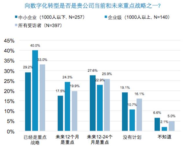 中桥2017年调研数据显示,有40%的企业级用户和33%所有用户已经将数字化转型作为业务的战略重点。未来24个月,47.2%企业级用户,45.8%所有用户将数字化转型作为业务重点。