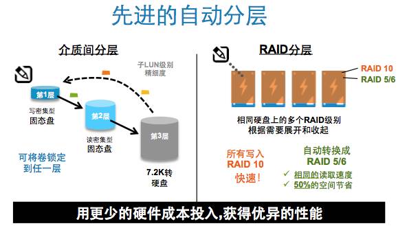 具备更好的设计理念,可以负担高性能和高存储使用效率,易于使用,具备智能分层与自动化管理功能,在扩展性上具备更好的灵活性。