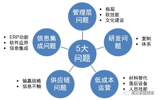 从2010年开始,欧阳生老师每年都要拜访大量的制造企业,在和他们管理层的交流中,在为他们提供咨询、辅导和培训服务的过程中,得以深入的了解到中国制造业自身存在的5大问题领域共13个问题,如下图所示: