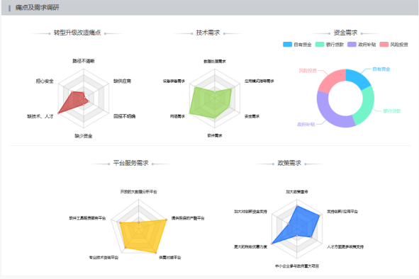 依托中国信通院自主研发的评估服务平台,为江苏某市的多家企业提供诊断评估服务,通过线上成熟度评估的方式,对企业在基础能力、战略组织、生产经营、产品服务、商业模式5个方面的综合应用水平进行了分析,再通过线下诊断,采用价值流分析和产线仿真的方式,发现企业的具体问题。评估服务覆盖了全市5个区,诊断发现企业应用核心问题共38个,挖掘出企业共性需求8项,并制定出不同企业数字化转型实施方案13份。
