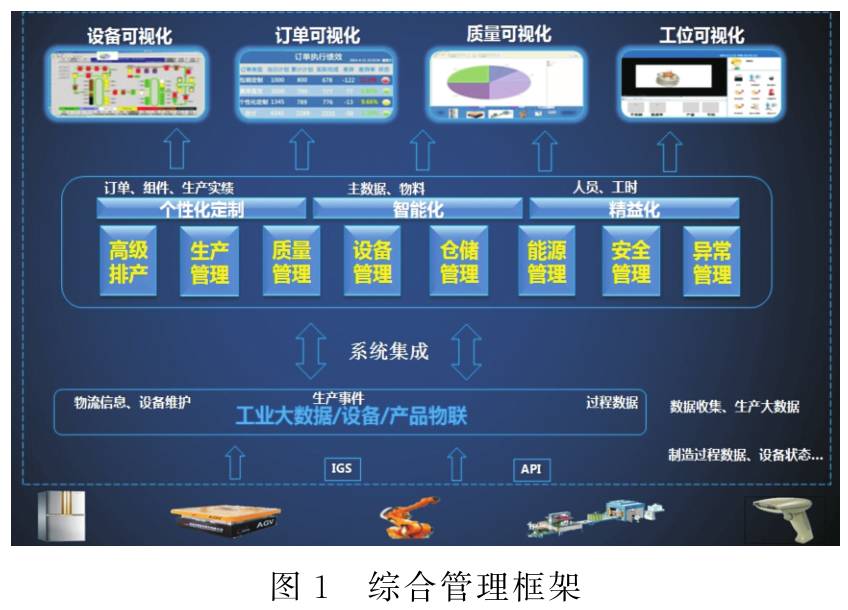 在设备之间和设备与操作者之间进行软联,通过设备系统所带的传感器或添加传感器来采集设备状态及生产数据信息,通过因特网、工业以太网、现场总线,实现了机器联网,快速进行在线数据检测,设定调整各种工艺参数,进行远程故障诊断。重点应用了郑州天启的 MES 系统、特吕茨勒的 T-Data 系统、品特的细纱单锭检测系统、洛菲的电清质量管理系统、长岭纺电的实验室管理系统,实现了数据集成、共享 。综合管理框架见图 1 。