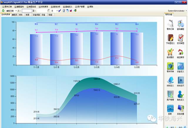 提供对材料利用率按总体、编程员、材料、板厚、设备、班组多个维度进行统计分析及图表输出,对套料明细、插单及超排情况、订单报工反馈进行明细查询及汇总,对材料收发进行统计汇总。包括:材料利用率查看、零件套料查看、超订单插排查看、订单MES反馈和材料收发查询等子模块。