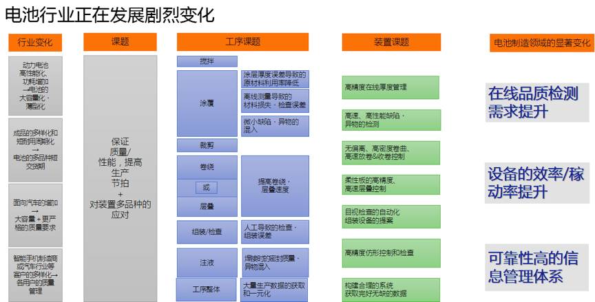 与此同时,电池行业的发展需求也出现了显著的变化,不论是智能手机领域对于快速充电和大容量电池的追求,还是新能源汽车对于高容量以及安全性的需求,都为电池行业带来了巨大的挑战,电池制造的革新将从以往的自动化效率的提升转向效率和品质并重的阶段。