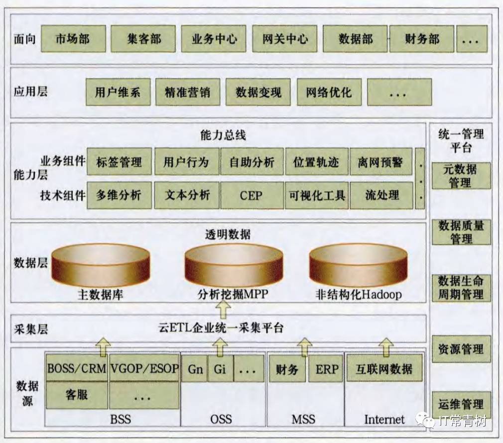 扩充数据源,沉淀企业数据资产:逐步打通B、M、O三域壁垒,构建IT共享资源池,具体可采用大二层技术来扩展二层网络,逐步将三域纳入同一个大二层范围内,一方面有利于扩大分析系统数据源,另一方面更有利于同一个大二层下的云化实施,此外为用户曾将基础属性数据,实现企业大数据平台多维全量的用户数据,包括:基础属性、位置信息、用户喜好标签,更便于实时精准营销,提高用户粘性,延长用户生命周期。