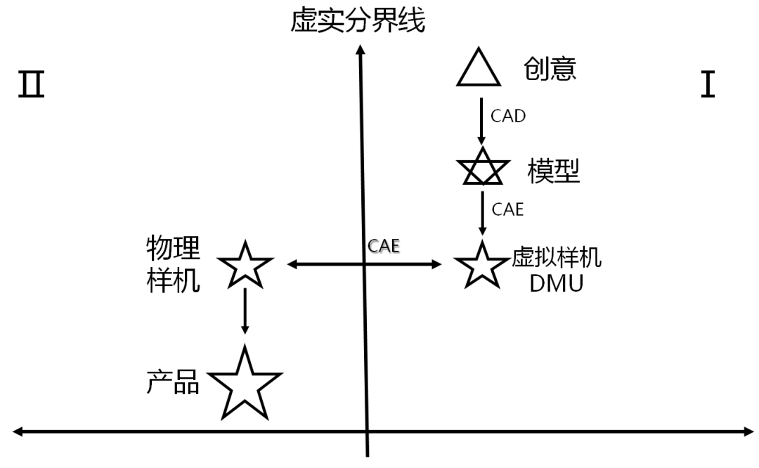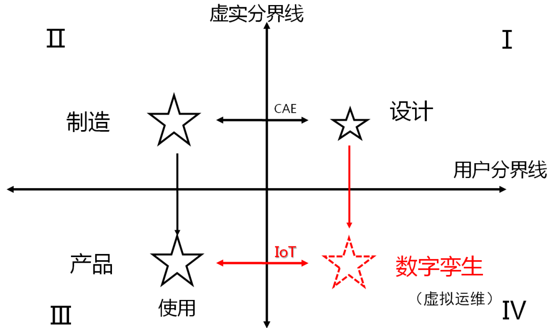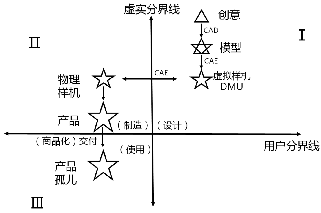 一个产品在数字化设计的过程,可以分解成各种颗粒度的数字模型。这些模型存在于一个世界,而物理产品和制造过程则存在于另外一个世界。这就是数字空间和物理空间的区别,二者可以看成是数学坐标轴上第一象限和第二象限的区别。中间存在着一条虚实分界线。