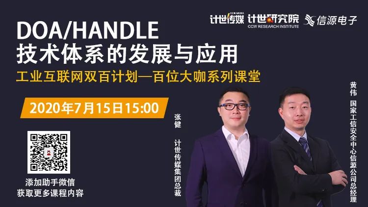 7月15日下午,“工业互联网双百计划——百位大咖系列课堂” 第二期在计世传媒顺利举办。课堂由计世传媒集团总裁张健主持,国家工信安全中心信源公司总经理黄伟发表了“DOA/Handle技术体系的发展与应用”的主题演讲,国内相关机构和企业代表共有1000多人参加了本次线上培训。