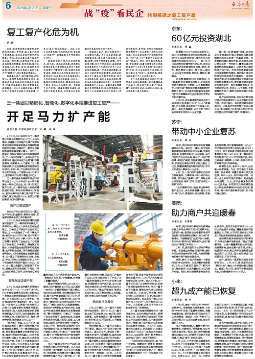 4月20日,《经济日报》刊文提到,三一集团是全球装备制造业的领军企业之一,2019年成为长沙首个销售收入破千亿元企业,自2月5日复工复产以来,三一集团积极采取精细化、智能化、数字化等手段为复工复产按下“快进键”,复工率达到100%,各项工作重回高效、有序运营轨道。