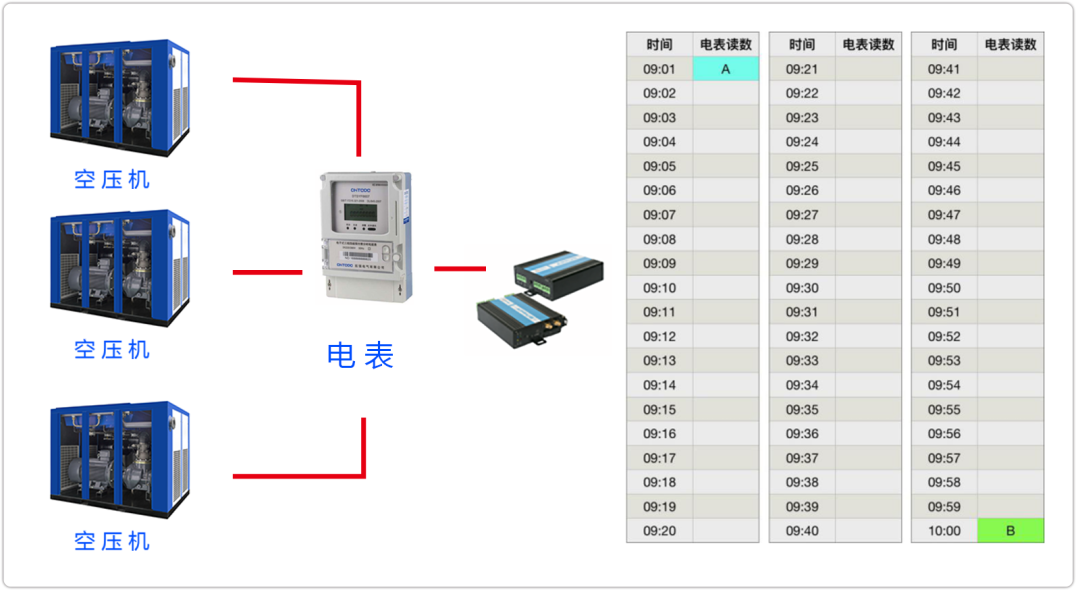 这是一个由三台空压机组成的空压气站,三台空压机共用了一个电表。假设我们用一个适配器每分钟采集一次电表的读数。我们希望知道,上午9—10点这一个小时里面,三台空压机的总耗电量,如下图所示。