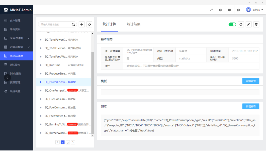 ▲ MixIOT统计计算配置界面截图MixIOT以统计计算命题(项目)的方式来进行数据计算,其中命题中主要包含了:把什么数据拿过来,用什么统计计算方法,按什么统计计算周期等关键内容。Statos把数据统计计算完成后,会把结果保存在Statos数据库中。这样,这个结果就可以被其他任何方式来使用了,比如在应用层去做一个可视化,实现数据的实时展现;比如在分析层去做一个深度分析。