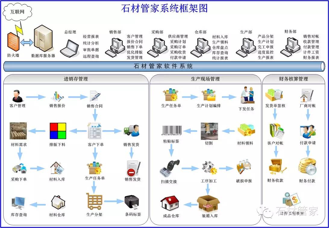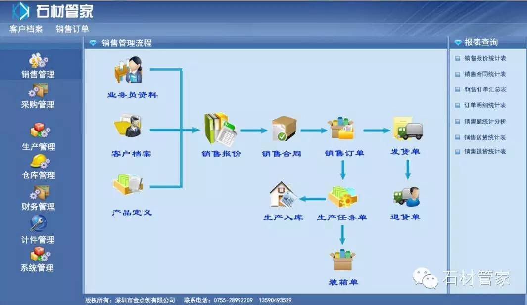 石材管家ERP管理软件为加工企业所普遍关心的订单管理、板材优化、标签管理、拆分流程卡、完工申报、生产进度监控、发货管理、计件工资方案及核算、采购管理、生产管理、仓库管理、财务管理、数据分析等提供完善的解决方案,是企业提升管理水平、标准化管理的重要工具。产品不仅采用了现代化的管理思想和技术,而且充分考虑公司多年以来在石材加工行业信息化推广工作中的实践经验和企业的实际情况,达到优化利用企业资源,增强企业对市场的应变能力,提高企业的相对竞争力和整体经济效益的目的。