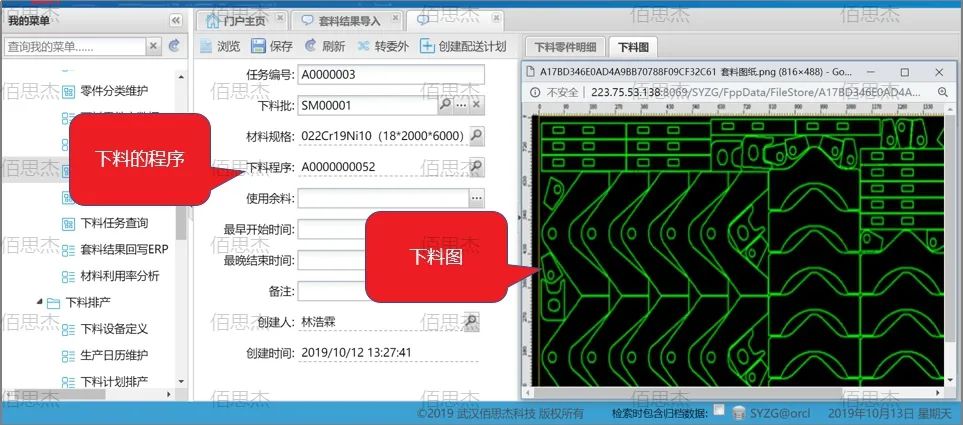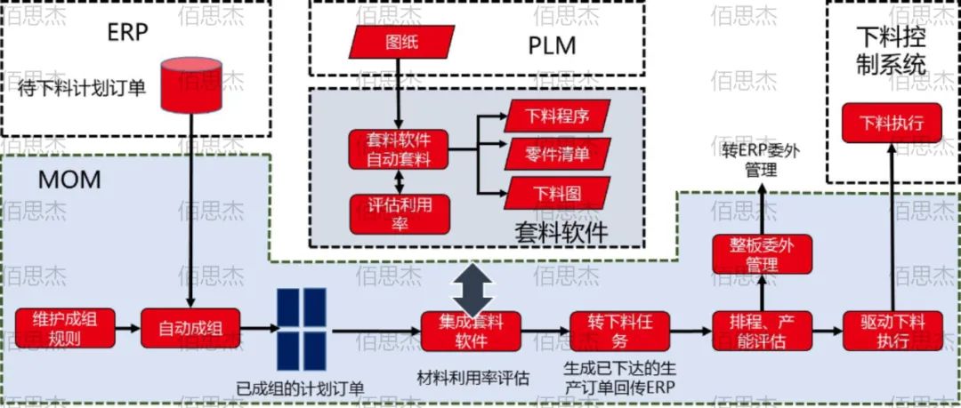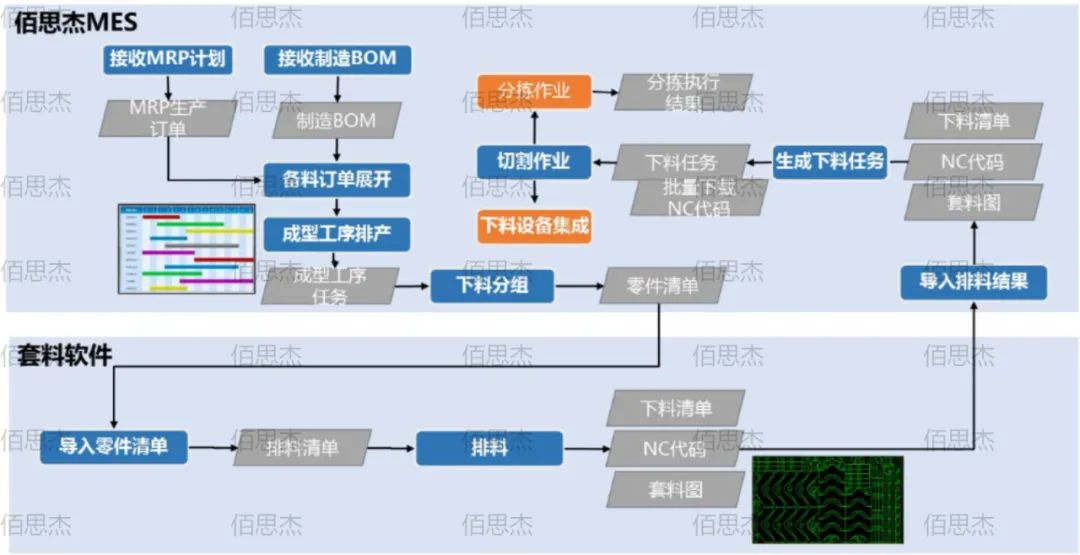 ▲ 下料成组管理和计划排程特点2钣金MES系统需要与套料系统协同应用钣金加工中,冲压和切割加工原材料通常是金属板料或卷料,为了提高原材料的利用率、减少废料和预料,很多钣金加工中就用到了套料(排料)软件,通过软件系统自动将钣金件在板材上进行模拟排布,并将套料结果生成NC程序,提供给钣金设备执行操作。在这个过程中,MES系统要实现对钣金作业的调度和监控,就需要与套料软件进行集成。通过集成,MES系统向套料软件下达钣金批次的成组规则,并获取套料反馈的结果以及钣金作业执行过程的相关数据。