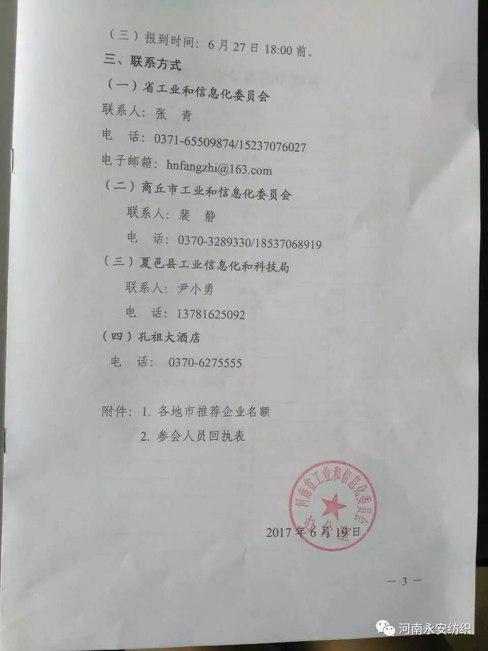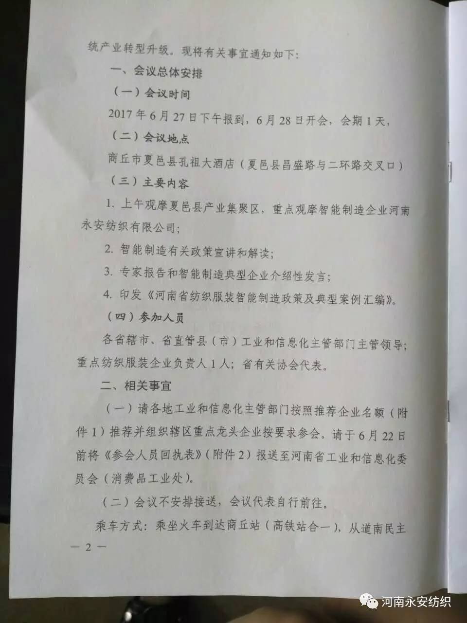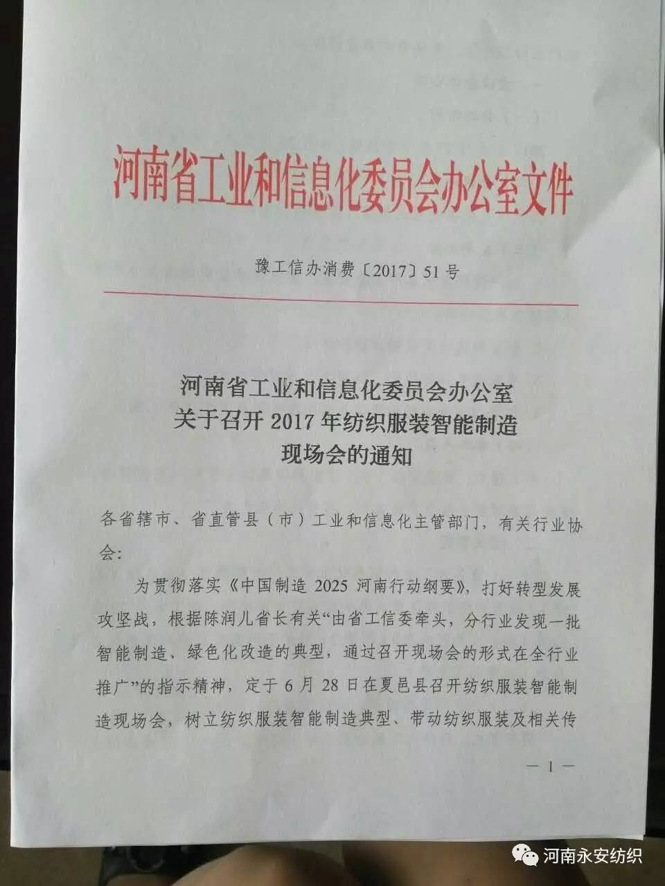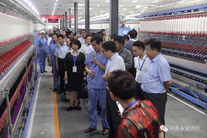 6月28日,河南省2017年纺织服装智能制造现场会在商丘夏邑县召开。河南永安纺织作为本次现场会重点观摩企业,迎来了省工信委、省纺织行业协会领导以及来自全省各地市工信部门和四十余家纺织服装企业同行们的参观交流。中国恒天经纬集团副总裁史建平、大客户部经理张旭华先生应邀出席会议。