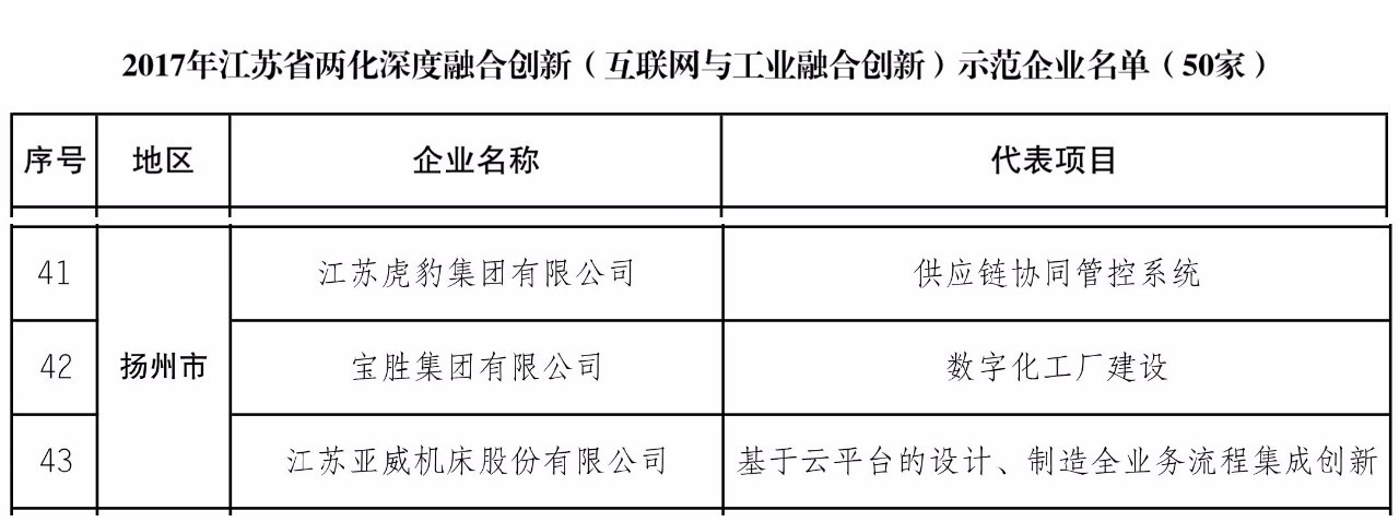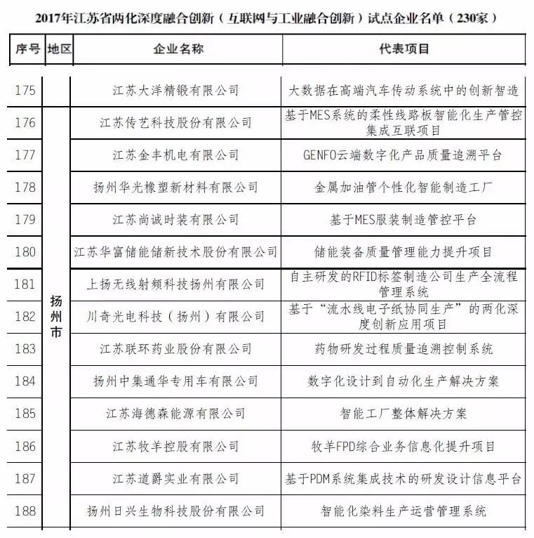 经各地审核推荐,省经信委组织形式审查、专家评审、示范候选现场考察和公示,现确定50家示范企业、230家试点企业。其中:扬州市入选示范企业3家,试点企业14家。