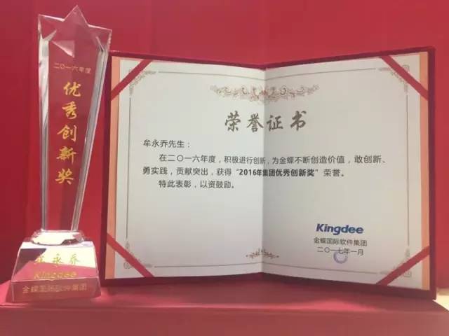获得2016年度金蝶集团优秀创新奖