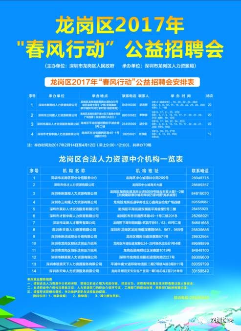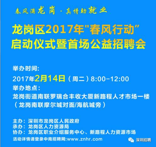据了解,为满足节后务工人员的就业需求,切实为全区经济“开门红”提供人才保障,龙岗区将于2月14日举办2017年“春风行动”公益招聘活动。
