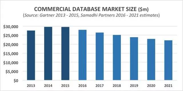 主题解释:对于那些对技术深究更有兴趣的人来说,下面从历史的角度更深入地解释了五个相互关联的趋势,这些趋势愈演愈烈,将共同导致商业数据库市场到2021年收缩20%至30%: