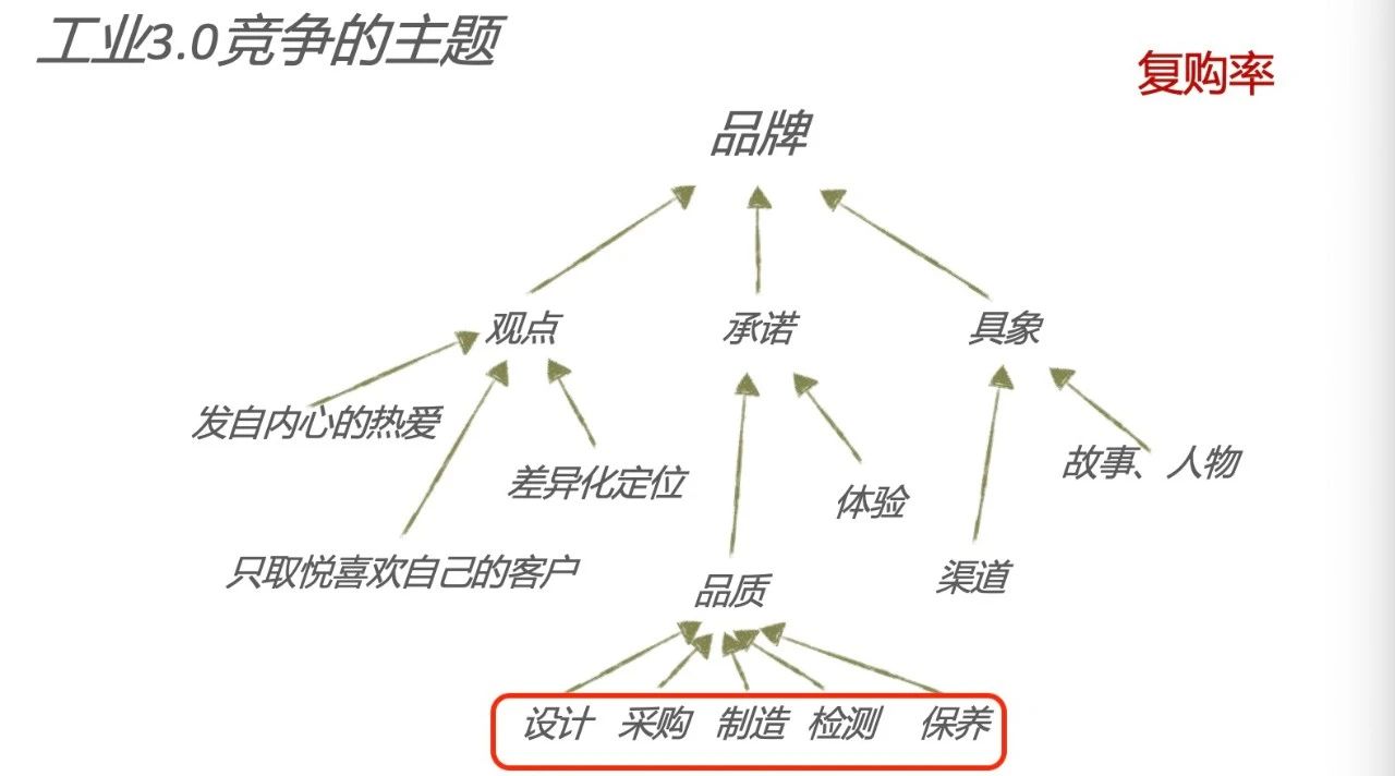 当然2.0的竞争方式是不可持续,所以到了3.0出现了一个竞争的主题是品牌,3.0不仅仅是看自动化,实际上品牌是作为竞争力,因为品牌最基本的定义是承诺,厂家对我生产的产品的一致性的承诺。而这种一致性的承诺再靠流水线的生产方式是无法达到的一致性,这个时候就不仅仅需要效率的提升,更需要用机器用全自动化生产线来保证,为什么要一致性,为什么要搞品牌?因为我们发现复购率比拉新更重要。所以,大规模的机器生产就开始采用了,那个时候强调效率品质、成本以及按时交付,工厂的核心竞争力就落到这里面。