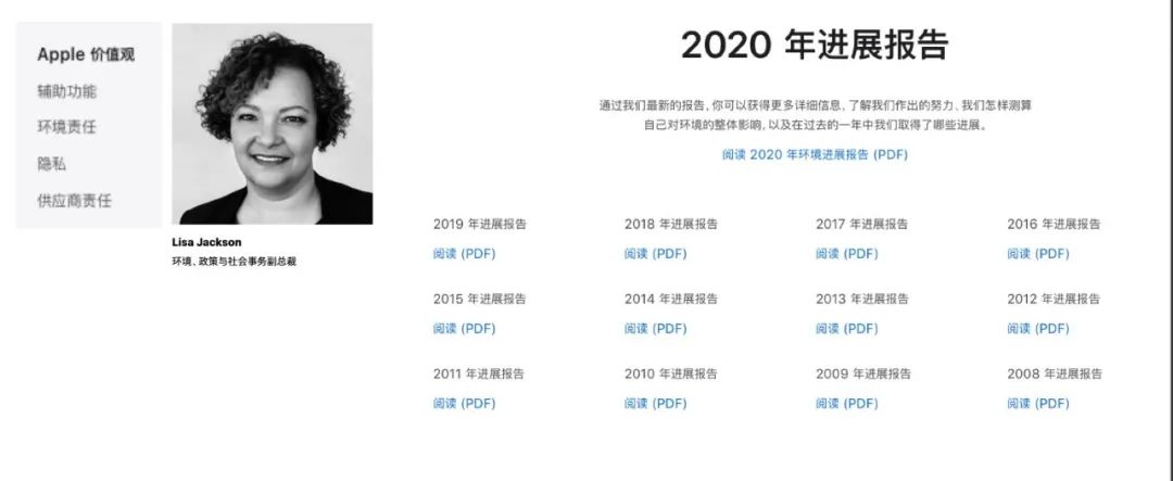 再一个例子,就是苹果,一个市值两万亿美金的公司有很多值得我们的学习的地方。在苹果网站有一个不起眼的地方,苹果在一开始有手机产品的时候就已经开始为残疾人做大量的辅助功能,旁白等等这些功能。在苹果体验店经常开小型讲座会教大家怎么用产品,这个小伙子就是视弱,他在教老年人怎么使用。在中国有残疾人士达到8900万,但是这家公司孜孜不倦做这个工作,全系列产品全部支持,所以它拿到了国际上的大奖。关于环保,现在买一台苹果电脑材料是全部回收的,对于老外来讲,他们认为这是环保,而且到今天,苹果的全球44家运营机构包括它的品牌店全部实现再生能源化,就是它的能源全部是再生能源,2030年以前全供应链完全碳综合,这个女士原来是美国环境总署的负责人,是苹果的死对头,苹果就让她来带一个队伍,她现在就在苹果干这么一件事,可以看到没有一个产品她每一年在环保方面的进步,每年都有,非常详细。