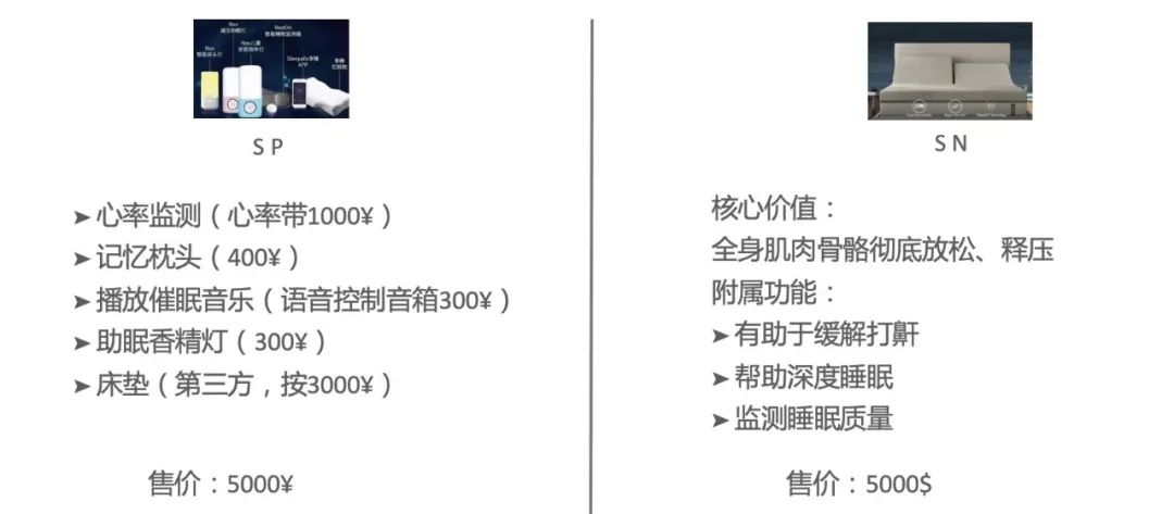 我们看一下他们的售价,第一家公司是5千人民币,床垫是第三方采购。硅谷这家公司的产品是5千美金。问大家,如果经济上没有太大负担的话,你会买哪个?有人说买左边,左边这家公司已经倒闭,右边这家公司卖的非常好。我们看一下核心技术对比,可以看得出来,这里没有任何一项技术是我们不具备或者不掌握。医学睡眠的学科,包括气压驱动这些技术都是没有任何问题,但是我们从来没有想办法组合在一起。所以很关键,我们现在的产品是不是从人的需求出发,还是把这些技术做一个简单堆积。这是我们教育领域不断给学生讲,你将来做任何产品就是要帮助他在商业上成功,要增加核心竞争力,而不只是一个技术。如果研发人员的商品不能创造价值的话,就是一堆技术。