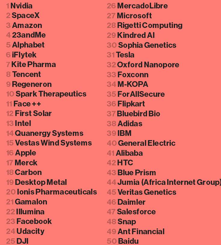 有9家来自中国,分别是科大讯飞(第6位)、腾讯(第8位)、旷视科技(第11位)、大疆(第25位)、富士康(第33位)、阿里巴巴(第41位)、HTC(第42位)、蚂蚁金服(第49位)、百度(第50位)。硅谷钢铁侠马斯克则是最大赢家,他有两家企业入选,SpaceX(第2位)和特斯拉(第31位)今年都在榜单中。去年排名第12位的英伟达,今年跃居至第1位。