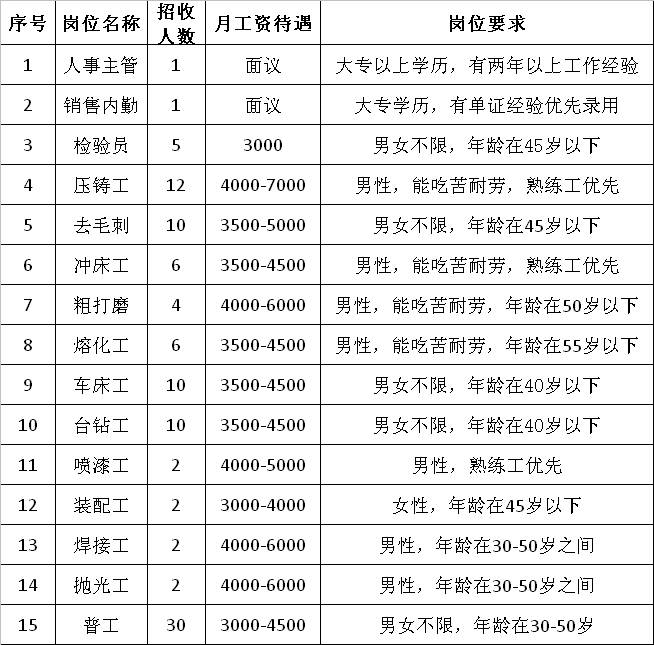 福利待遇:包吃包住,缴纳五险一金。以上人员要求身体健康、品行端正,有意向者请在2月4日(年初八)开始携带相关身份证件来公司报名。