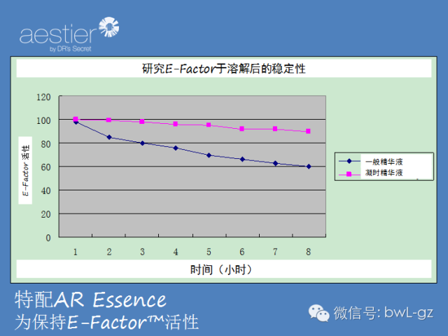 您在这里看到,当与凝时精华液溶解后,E-Factor的活性持高,保持原有活性超过90%,甚至持续8小时后也一样。然而对于一个用其他精华液溶解锭片的情况,其活性已下降到只有60%。