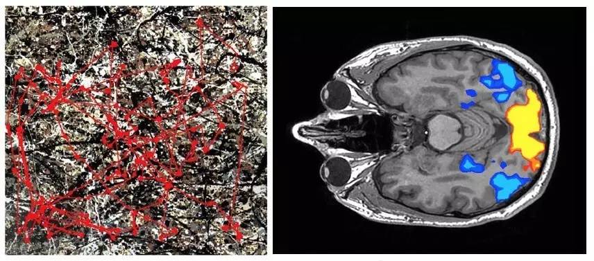 (左)红色轨迹显示了观察者看着杰克逊·波洛克分形画的时候,视线的分形运动。(右)当观察分形图案时,fMRI扫描显示出来的激活的大脑区域。