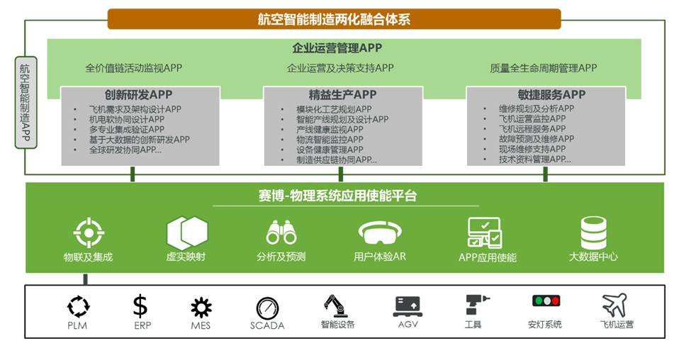 一是新技术支撑 IT/OT融合。基于物联及集成、虚实映射、分析及预测、用户体验、大数据管理等新技术,实现设备、车间、企业级的垂直集成,重点解决异构设备互联、设备 /系统的互联、大数据管理等关键能力。其中,PLM、ERP、MES等 传统IT应用体系将与数据采集与监控系统(SCADA)、硬件设备、物理飞机等运营技术(OT)体系进行融合,以打通数字化和物理运营环节,为业务转型优化提供基础支撑。
