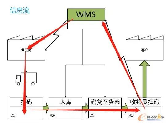 上图即为商超的WMS系统的流程,粗线体表示物料实际流转的物理状态流,细的线体表示信息流。