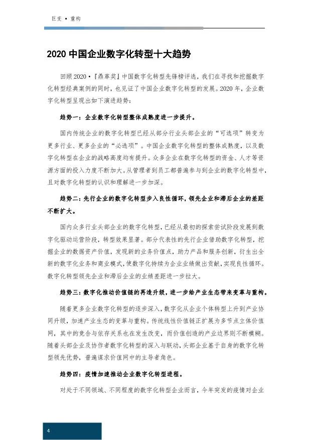 趋势四:疫情加速推动企业数字化转型进程。今年的疫情对企业近年的数字化转型成果进行了检验。同时,疫情也使企业更强烈地意识到数字化转型的重要性,加快了各类数字化项目的建设和上线速度。