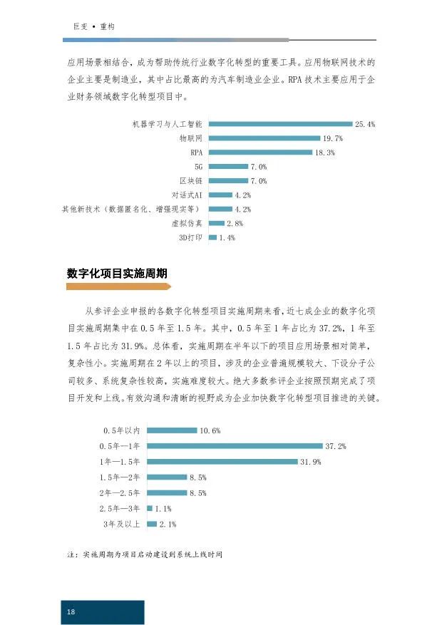 参评企业积极应用AI、IoT、区块链等新技术。其中,应用比例最高的是机器学习与人工智能技术,占比为25.4%。其次为物联网技术,占比为19.7%,第三位为RPA技术,占比为18.3%。AI在众多行业都能找到落地场景,与企业具体应用场景相结合,成为帮助传统行业数字化转型的重要工具。应用物联网技术的企业主要是制造业,其中占比最高的为汽车制造业企业。RPA技术主要应用于企业财务领域数字化转型项目中。