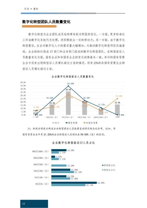 数字化转型为企业团队成员结构带来较为明显的变化。一方面,更多标准化工作由数字化系统代为处理,进而释放出一定的劳动力;另一方面,由于数字化转型需求,企业对数字化人才的需求量大幅增加。
