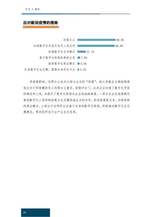 受疫情影响,远程办公成为大部分企业的“刚需”。绝大多数企业都能够高效应对不同规模的员工远程办公需求。疫情冲击下,众多企业加速了数字化项目的建设和上线,并提升了数字化转型在企业的战略高度。一部分企业在疫情期间借助数字化工具积极拓展与生态圈其他企业的合作,尝试拓展新业务,并探索新的商业模式。小部分行业领军企业基于自身的数字化转型,积极推动数字化生态圈建设,带动其所在行业产业生态变革。