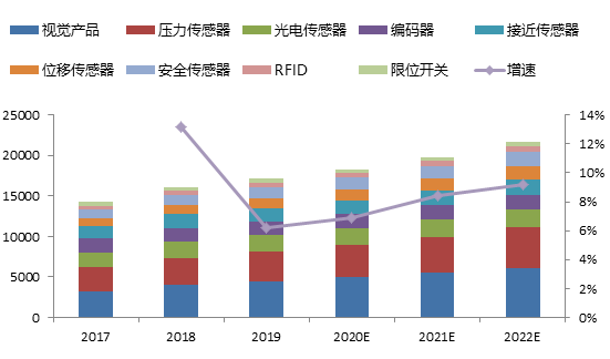 作为细分领域,值得关注的是视觉类传感器,其整体市场近两年发展良好,增速保持在20%。预计未来这种增长势头将可延续,主要原因在于其应用范围的扩大。机器视觉目前的3D技术可运用于多种场景,深度学习也开始逐渐运用于瑕疵识别等新场景。