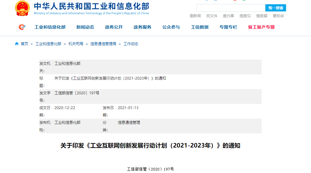 1月13日,工业和信息化部印发《工业互联网创新发展行动计划(2021-2023年)》,提出到2023年,我国工业互联网新型基础设施建设量质并进,新模式、新业态大范围推广,产业综合实力显著提升。