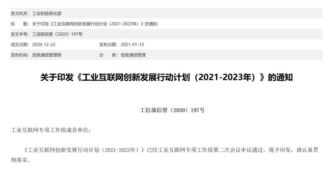近日,工信部发布了“关于印发《工业互联网创新发展行动计划(2021-2023年)》的通知”,在基础设施、融合应用、技术创新、产业生态、安全保障等方面进行部署。