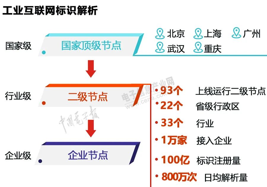 2020年,我国工业标识解析体系实现了从“1”到“N”的跃进,基础设施初见规模。截至2020年年底,我国工业互联网标识解析已经在北京、上海、广州、武汉、重庆五大国家顶级节点稳定运行,南京、贵阳两个灾备节点启动建设,上线运行二级节点达93个,覆盖22个省级行政区,包含船舶、集装箱、汽车、石化、食品、医疗器械等33个行业,接入企业突破1万家,标识注册量已超100亿,日均解析量已近800万次。