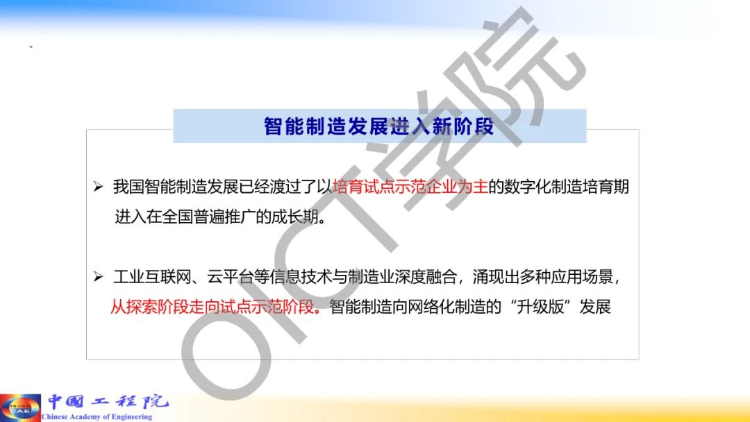 近日,在OICT学院公益讲堂上,中国工程院战略咨询中心制造业研究室特聘专家、中国智能制造标准化专家副组长董景辰教授作“智能制造发展动向”演讲。董景辰认为,我国智能制造发展进入新阶段,已经渡过了培育试点示范企业为主的数字化制造培育期,进入在全国普遍推广的成长期,智能制造向网络化制造的“升级版”发展。报告PPT来自OICT学院,版权归原作者所有,仅供学习交流,由《走向智能论坛》公号推荐阅读。