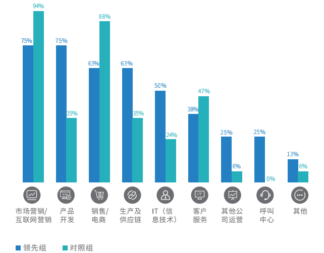与之相对照,对照组中有近1/3的企业希望在1年的短期内看到财务绩效。数字化转型具有长期性,大多数数字化转型领先企业,首任数字化领军人任职超过3年。从数字化转型负责人任职时间看,相对长期和稳定的任职时间,有利于数字化取得较好成效。从总体来看,近半数的企业领导层(44%)能够忍受较高的试错成本。36%的被访者表示,领导层希望在12-18月内看到可以衡量的财务结果,能够忍受一定的试错成本。希望在一年内看到可以衡量的财务结果,要求尽量减少试错成本的企业领导层则占20%。这表明大多数企业对数字化转型需要允许试错已取得共识。数字化转型领先企业的领导层大多数都更看重较为长期的战略结果,对数字化转型试错成本的容忍度较高,而对照组领导层则希望在短期内看到财务成果,对试错成本的容忍度也较低。报告认为,企业对试错的宽容并不意味着,企业不需要清晰的战略目标,相反数字化转型较为成功的企业,在对数字化的理解,在企业战略目标上,都是十分清晰的。试错更多的是在具体的创新项目上,由于没有成功经验可以借鉴,因此可能会出现失败,这时需要企业有足够的宽容度,积极的总结经验,而不是去追究项目成员的责任。四领先企业的数字化变革,开始向产品和协同深入发展对比领先组企业和对照组企业,一个直观的发现是领先组企业,逐渐实现了数字化在企业内的全面渗透,而对照组企业更多的仍集中在营销和电商领域。领先组企业在“产品研发”维度显著领先对照组企业(75% vs 35%)。这说明领先组企业已经将数字化技术直接服务产品的研发和改进,直接提升产品性能和质量,通过提升产品价值,来塑造差异化的竞争优势,而不仅仅是在营销环节通过效率提升或成本降低的方式来获得价值。领先组企业,在“生产及供应链”一项上也取得了明显的领先优势(63% vs 35%)。供应链环节的数字化往往能够提升企业的协同效应,因此我们推断,领先组企业实现了与上下游或企业生态伙伴更为无缝的协同,具有更显著的协同效应,具备更强的价值共创和应对危机的能力。