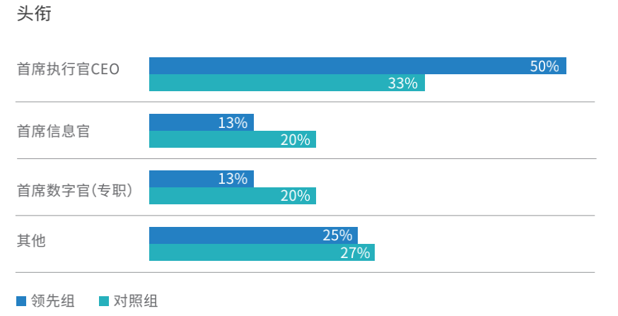 调研结果显示,在数字化转型领先组企业中,50%由CEO直接推动。而对照组企业仅有33%由CEO推动。报告认为,数字化转型是企业“一把手工程”,需要推动者具有全局意识和战略高度,因此数字化转型由CEO直接推动更容易产生成效。优秀的领导者能够将数字化融入公司战略,并对未来做出积极的部署;同时他们能够推动公司从整体做出变革,各职能部门协调推进,配合公司整体转型的落地实施。
