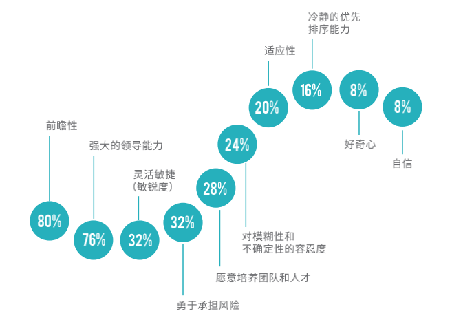 从转型阶段来看,领先组中有63%的企业已经在数字化转型中取得了初步成效。25%的领先组处于“已有成功样本,正在推广和深化阶段”。而对照组企业更多的处于“规划和尝试阶段”以及“持续的探索和试错阶段”。值得注意的是,领先组中,没有企业处于2年以上的探索和试错阶段,而对照组这一比例高达35%。报告认为,成功的数字化转型需要有较清晰、系统的战略规划,并进行有效的实施推动。二具有前瞻性、领导力和敏捷性的“一把手”更容易实现转型调研样本认为,前瞻性、强大领导力和灵活敏捷、勇于承担风险是被访企业认为数字化转型领军人物需要具备的主要特征。