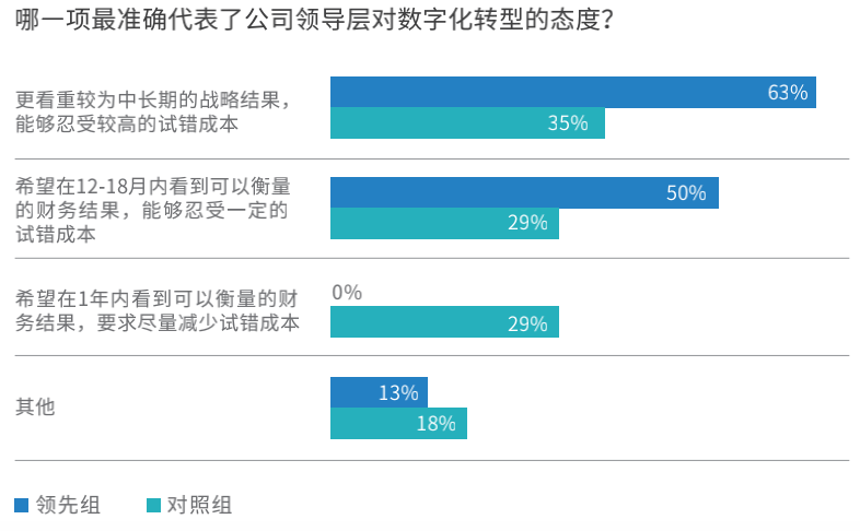 企业中层管理人员,在企业中承担着“上传下达”的纽带作用,中层管理人员的观望情绪,会影响企业高层决策的贯穿执行,使数字化转型的落地实施效果受到影响。三对失败容忍度较高的企业可以收获更好的回报调研发现,在数字化转型领先企业中,有63%的企业表现出较高的试错容忍度,超过50%的企业愿意在1年以上的时间尺度上评估数字化转型的成效。并且没有一家企业要求在1年之内看到可衡量的财务结果。